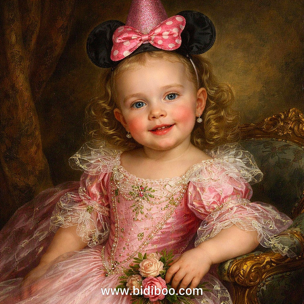 • A joyful toddler wearing a sparkly party hat with mouse ears and a big pink bow sits in a high chair, grinning widely while enjoying a snack of chips, sandwich, and a pink sippy cup with a cow topper on the tray.